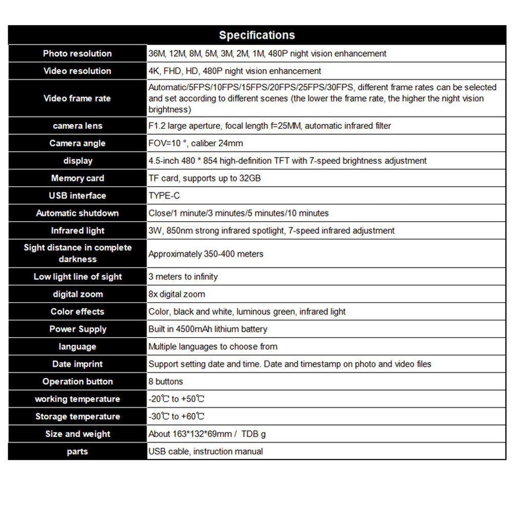 Photo resolution 36M, 12M, 8M, 5M, 3M, 2M, 1M, 480P night vision enhancement