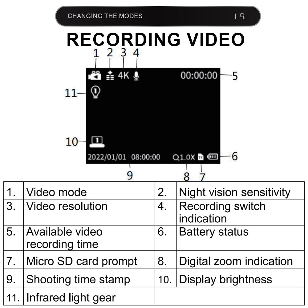 Video resolution 4K, FHD, HD, 480P night vision enhancement