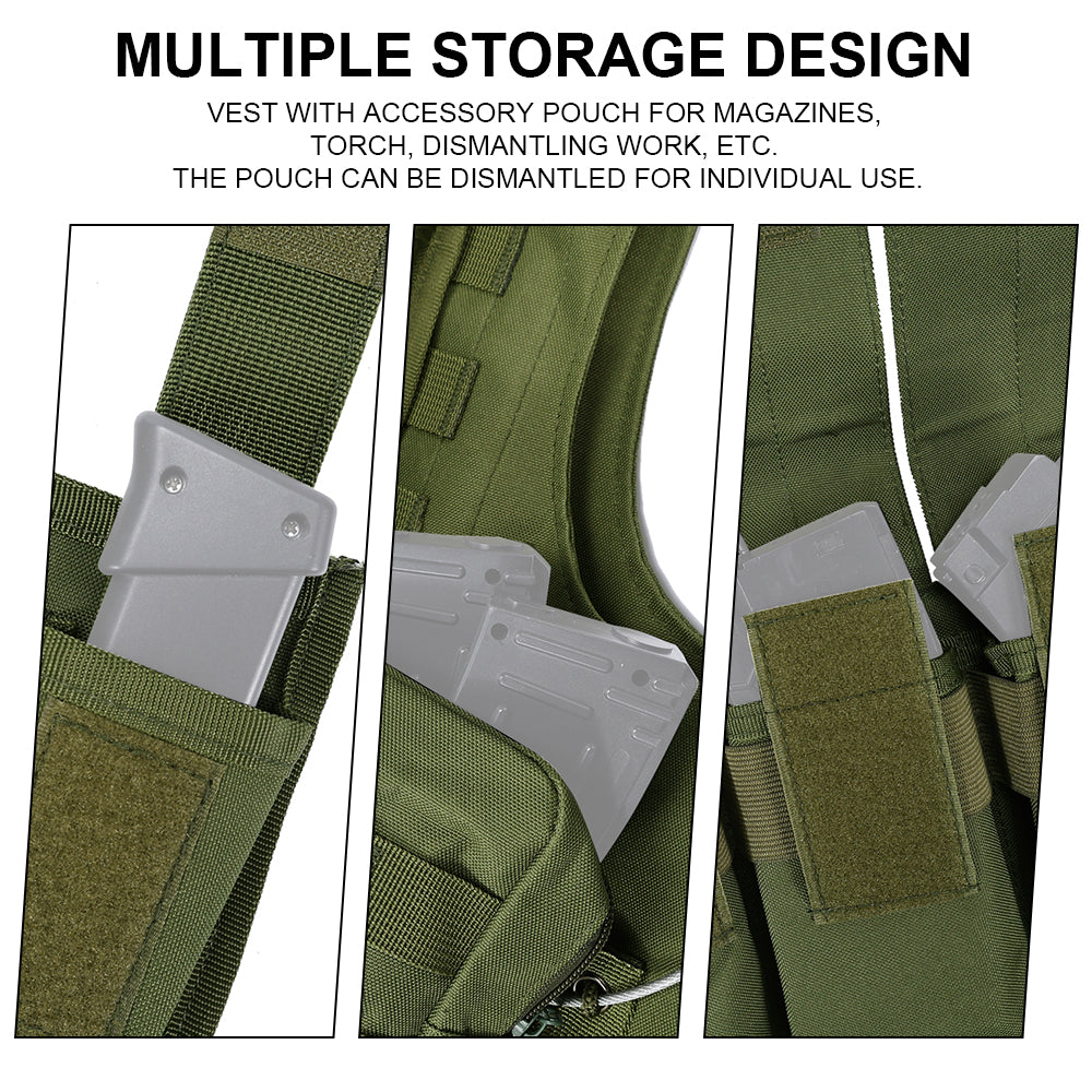 - Shoulder and waist side part adopt tape and buckle design which enables you to wear and take off this tactical vest rapidly and conveniently.